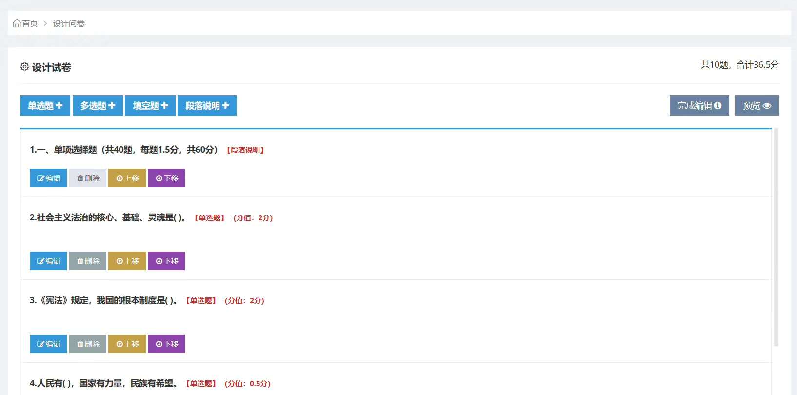 簡(jiǎn)易性:支持批量導(dǎo)入各種類型文件題庫,支持固定試卷、抽題試卷和隨機(jī)試卷,自動(dòng)生成統(tǒng)計(jì)報(bào)表。